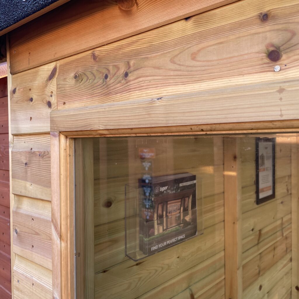 The model we inspected had four fixed windows, and what struck us immediately was the external window framing. On Tiger’s standard 12mm shiplap sheds, you don’t get this. Here, you do — and aesthetically, it makes a big difference. Psychologically, it also just feels more secure. The building looks finished, not patched together.