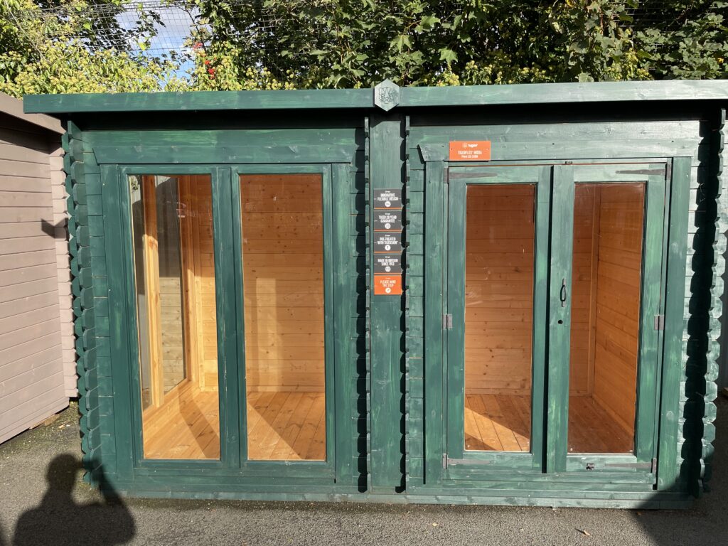 When you spend as much time at show sites as we do, a few models jump out instantly. The TigerFlex Moda was one of those moments at the Otley site — a splash of bold colour in a sea of pine. Finished in TigerSkin Green, it looked almost luminous against the November sky: more modern garden studio than log cabin, more statement than background. You could tell from ten metres away that this was something different.